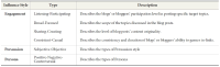 Blogs are readily available sources of opinions and sentiments which allows bloggers to exert a certain level of influence over the blog readers. Previous studies had attempted to analyze blog features to detect influence within the blogosphere, but had not studied in details influence at the blogger-level. Other studies studied bloggers’ personalities with regards to their propensity to blog, but did not relate the personalities of bloggers to influence. Bloggers may differ in their way or manner of exerting influence. For example, bloggers could be active participants or just passive shares, or whether they express ideas in a rational or subjective manner, or they are received positively or negatively by the readers. In this paper, we further analyze the engagement style (frequency, scope, originality, and consistency of the blog postings), persuasion style (appeals to reasons or emotions), and persona (degree of compliance) of individual bloggers. Methods used include similarity analysis to detect the sharing-creating aspect of engagement style, subjectivity analysis to measure persuasion style, and sentiment analysis to identify persona style. While previous studies analyzed influence at blog site level, our model is shown to provide a fine-grained influence analysis that could further differentiate the bloggers’ influence style in a blog site.