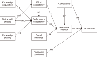 Online learning is becoming ubiquitous worldwide because of its accessibility anytime and from anywhere. However, it cannot be successfully implemented without understanding constructs that may affect its adoption. Unlike previous literature, this research extends the Unified Theory of Acceptance and Use of Technology with three well-known theories, namely compatibility, online self-efficacy, and knowledge sharing and acquisition to examine online learning adoption. A total of 264 higher education students took part in this research. Partial Least Squares-Structural Equation Modeling was used to evaluate the proposed theoretical model. The findings suggested that performance expectancy and compatibility were significant predictors of behavioral intention, whereas behavioral intention, facilitating conditions, and compatibility had a significant and direct effect on online learning’s actual use. The results also showed that knowledge acquisition, knowledge sharing, and online self-efficacy were determinates of performance expectancy. Finally, online self-efficacy was a predictor of effort expectancy. The proposed model achieved a high fit and explained 47.7%, 75.1%, 76.1%, and 71.8% of the variance of effort expectancy, performance expectancy, behavioral intention, and online learning actual use, respectively. This study has many theoretical and practical implications that have been discussed for further research.