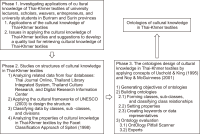 This study aims to develop ontologies regarding cultural knowledge of Thai-Khmer textiles by applying the Knowledge Engineering Methodology to build upon the ontologies. The process includes 1) generating the ontologies’ objectives, 2) building ontologies, and 3) evaluating the ontologies. The researchers used OntOlogies Pitfall Scanner (OOPS!) to minimize defects and asked two experts to evaluate the ontologies’ design. Protégé was used to design the ontologies, and WIDOCO was used to present the ontologies through the World Wide Web. It was found that the developed ontology consists of two classes, 16 sub-classes, and 16 relationships. The ontologies assessment found that there were seven items to fix according to the OOPS! software. Apart from the assessment program, the experts mentioned that all five aspects were suitable; namely, the ontology design was evaluated at 4.51 (Likert), the process of identifying scopes of definitions and objectives of development was 4.61, the applications and guidelines for further development was 4.58, the process of forming classes was 4.53, and the process of generating class’s properties was 4.50.
