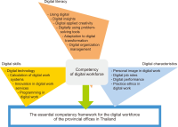 This study aimed to study its required performance requirements and proposes a competency framework necessary for the digital workforce of the Provincial Offices in Thailand. The specific primary informants were determined as 17 people. The collecting process was performed using the Delphi technique and the electronic Delphi technique in two phases, totaling four rounds. In the first time, a structured interview was used to conduct online interviews for 15 people. Content validation was performed to determine issues of the competency framework essential for the digital workforce with 7-level scaled questionnaires, and then online reviews were collected between 10-15 people (2nd to 4th times). A consensus was found and confirmed four times with descriptive statistics, namely frequency, mean, standard deviation, mode, median, and the absolute value of the difference between mode and median, interquartile range, and application of the conceptual framework. The research findings revealed that the essential competency requirements for the digital workforce were covered in digital literacy (six aspects), digital skills (four aspects), and digital characteristics (four aspects). Consensus was confirmed for 84 issues. Therefore, it was concluded that 61 points for building an essential competency framework for the digital workforce made them effective in using digital technology as a labor-saving instrument, as well as for expanding the breadth of development of digital expertise to include members of the organization’s digital practitioner network. This development will benefit government agencies and the private sector, both national and international, in the future.