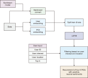 Sentiment analysis is one of the promising approaches for developing a point of interest (POI) recommendation system. It uses natural language processing techniques that deploy expert insights from user-generated content such as reviews and feedback. By applying sentiment polarities (positive, negative, or neutral) associated with each POI, the recommendation system can suggest the most suitable POIs for specific users. The proposed study combines two models for POI recommendation. The first model uses bidirectional long short-term memory (BiLSTM) to predict sentiments and is trained on an election dataset. It is observed that the proposed model outperforms existing models in terms of accuracy (99.52%), precision (99.53%), recall (99.51%), and F1-score (99.52%). Then, this model is used on the Foursquare dataset to predict the class labels. Following this, user and POI embeddings are generated. The next model recommends the top POIs and corresponding coordinates to the user using the LSTM model. Filtered user interest and locations are used to recommend POIs from the Foursquare dataset. The results of our proposed model for the POI recommendation system using sentiment analysis are compared to several state-of-the-art approaches and are found quite affirmative regarding recall (48.5%) and precision (85%). The proposed system can be used for trip advice, group recommendations, and interesting place recommendations to specific users.