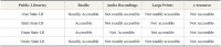 Public libraries provide information to all persons and its users are the inhabitants of the community it serves. This may not be the reality in some cases as some category of persons may not be properly served by the public library. This study assesses the provision of information materials in alternative format, in terms of its availability, access and level of use by the visually impaired in public libraries in southwestern Nigeria. The study adopted survey research design. Four (4) public libraries in four states were purposively selected because they are the ones that provide alternative format for the use of a sizable number of the visually impaired. Complete enumeration was used to capture all the 166 registered users of the libraries through the use of observations checklist and interview schedule. Data from 69.2% of the 166 visually impaired persons that were interviewed, and the observations made were analyzed. The result reveals that alternative formats availability were inadequate and , e-resources were not available while access to formats and information desired by the users were limited. Braille is the most utilized format; audio materials and large prints were seldom used. The demand for alternative formats is high but it is not related to level of use of materials. Provision of information materials in alternative formats for the visually impaired in public libraries cannot support the needs of the visually impaired; it requires intervention from all stakeholders. The study recommends improved investment and funding for public libraries and services to persons with disabilities.