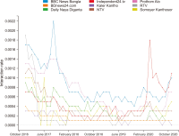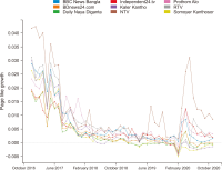 Social media has become a popular source of information around the world. Previous studies explored different trends of social media news consumption. However, no studies have focused on Bangladesh to date, where social media penetration is very high in recent years. To fill this gap, this research aimed to understand its popularity trends during the period. For that reason, this work analyzes 97.67 million page likes and 3.48 billion interaction data collected from nine Bangladeshi news media’s Facebook pages between December 2016 to November 2020. The analysis shows that the growth rates of page likes and interaction rates declined during this period. It suggests that the media’s Facebook pages are gradually losing their popularity among Facebook users, which may have two more interpretations: Facebook’s aggregate appeal as a news source is decreasing to users, or Bangladeshi media’s appeal is eroding to Facebook users. These findings challenge the previous results, i.e., Facebook’s demand as a news source is increasing with time. We offer four explanations of the decreased popularity of Facebook’s news: information overload, exposure to incidental news, users’ selective exposure and different aims of using Facebook, and conflict between media agendas and users’ interests. Some theoretical and practical significance of the results has been discussed as well.