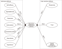 Research collaboration is an important strategy to improve research output, and virtual academic communities (VACs) have become an important platform to collaborate on. This paper reveals the influencing factors of researchers’ collaboration intention in VACs from two attributes: individual, and inter-members. On the basis of the Social Cognitive Theory, Social Exchange Theory, social network theory, and Five-Factor Model, this paper constructed a model demonstrating the influencing factors of VACs researchers’ collaboration intention. A self-administered questionnaire was employed on members of four VACs in China to collect data; subsequently, 558 usable responses were analyzed using structural equation modeling. The result showed that openness, conscientiousness, reciprocity, trust, and the social network characteristic had a significant influence on the collaboration intention of researchers in VACs, while self-efficacy, agreeableness, extroversion, neuroticism, and experience had no significant effects on the collaboration intention of researchers in VACs. This model plays a positive role in promoting the research collaboration intention of Chinese VACs researchers and in guiding the construction of VAC platforms.