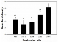Hulunbuir steppe, one of the four largest steppes in China, has experienced rapidly progressing desertification partly due to overgrazing by livestock. The objective of this study was to investigate the effectiveness of various vegetation recovery methods, including the selection of unpalatable plants less affected by grazing livestock. To determine livestock grazing preferences at Hulunbuir restoration sites, we used DNA barcoding methods to analyze fecal materials of horses and cattle grazing on four restored plants: two trees (Pinus sylvestris L. var. mongolica and Populus canadensis) and two shrubs (Caragana microphylla and Corethrodendron fruticosum). Neither of the two tree species were detected in livestock feces, whereas both shrub species were detected at low frequencies. There were no significant differences in compositions of species consumed by horses and cattle except that Asteraceae species were more often consumed by cattle. Our results showed that the four plants used for restoration may be classified as unpalatable or less palatable species in the Hulunbuir restoration area. Our results may help inform restoration strategies implemented in restoration areas, especially regarding negative effects of livestock grazing during the initial stage of restoration in Hulunbuir.
