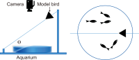 The escape behavior of prey fish to predator attack is directly linked to the survival of the fish. In this study, I explored the escape behavior of Medaka fish to bird attacks. To simulate the attack, I designed a model triangular-shaped bird to slide along a fishing line connected between rods at both ends of the tank. The triangular shape was set to 10×15 (S=1), 15×20 (S=2), and 20×25 cm (S=3) with base×height. The slope (θ) of the fishing line, which determines the attack speed of the model bird, was set to values of 15° (θ=1), 30° (θ=2), and 45° (θ=3). The escape behavior was characterized using five variables: escape speed (v), escape acceleration (α), responsiveness (γ), branch length similarity entropy (ε), and alignment (φ). The experimental results showed when (S, θ)=(fixed, varied), the change in values of the five variables were not significant. Thus, the fish respond more sensitively to S than to θ In contrast, when (S, θ)=(varied, fixed), v, α, and γ showed increasing trends but ε and φ did not change much. This indicates the nature of fish escape behavior irrespective of the threat is inherent in ε and φ. I found that fish escape behavior can be divided into two types for the five physical quantities. In particular, the analysis showed that the type was mainly determined by the size of the model bird.