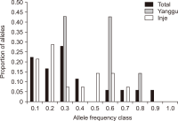 Natural habitats of the Korean long-tailed goral (Naemorhedus caudatus) have been fragmented by anthropogenic activities in South Korea in the last decades. Here, the individual identity, genetic variation, and population differentiation of the endangered species were examined via the multiple-tube approach using a non-invasive genotyping method. The average number of alleles was 3.16 alleles/locus for the total population. The Yanggu population (1.66) showed relatively lower average number of alleles than the Inje population (3.67). Of the total 19 alleles, only seven (36.8%) alleles were shared by the two populations. Using five polymorphic out of six loci, four and six different goral individuals from the captive Yanggu (n=24) and the wild Inje (n=28) population were identified, respectively. The allele distribution was not identical between the two populations (Fisher’s exact test: P<0.01). A considerably low migration rate was detected between the two populations (no. of migrants after correction for size=0.294). Additionally, the F statistics results indicated significant population differentiation between them, however, quite low ( FST=0.327, P<0.01). The posterior probabilities indicated that the two populations originated from a single panmictic population (P=0.959) and the assignment test results designated all individuals to both populations with nearly equal likelihood. These could be resulted from moderate population differentiation between the populations. No significant evidence supported recent population bottleneck in the total Korean goral population. This study could provide us with useful population genetic information for conservation and management of the endangered species.’