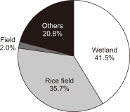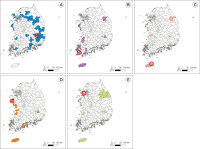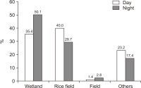 The spring home range and habitat use of the spot-billed duck in Korea were studied using GPS-mobile phone-based telemetry (WT-300). The study areas were Anseong-si, Seosan-si, Nonsan-si, and Sejong-si. Analysis was performed using minimum convex polygon (MCP) and kernel density estimation (KDE) spot-billed ducks had an average home range of 70.28 km² (standard deviation [SD]=84.50, n=6), and a core habitat (50%) 2.66 km² (SD=2.60, n=6), according to MCP and KDE, respectively. Wetlands (41.5%) and rice fields (35.7%) were highly used as habitats. The rice field use rate was high during the day, and the wetland utilization rate was high at night. Rice fields and wetlands were the primary habitats in spring.