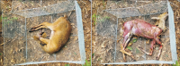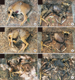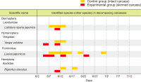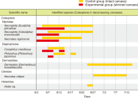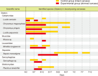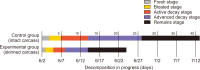 Forensic entomology is a field of study that includes the succession of insects attracted to and found on cadavers. One of its main focusses is estimating post-mortem interval (PMI) based on the growth stage of insects found in and around human cadavers. In many countries, the diversity of insect occurrence is studied in relation to the environmental conditions a cadaver may be exposed to or the effects of different clothes. In this study, changes in the decomposition process and differences in insect succession were investigated by comparing skinned and intact water deer carcasses. Five orders, 15 families, and 21 species of insects were identified, most of which were Dipteran and Coleopteran. The skinned carcass decomposed more rapidly than the intact carcass, which was linked to differences in insect succession. The difference in the decomposition rate and insect succession according to the external conditions of the carcass can be used as basic data for estimating the PMI of the carcass and setting the forensic entomological indicator species.