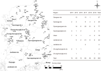 We analyzed data of endangered mammals in the 1st grade zone of the Ecological and Natural Map of Korea that were obtained through 202 field surveys over six years. Five endangered mammal species were identified including otters, long-tailed gorals, martens, leopard cats, and flying squirrels. The total number of habitat traces collected was 918, of which 897 traces (97.7%) were excrement types. The total surveyed distance was 697.7 km and there were 2,184 grids of 250×250 m each. Of these grids, 441 or 20.2% were confirmed as habitats of endangered mammals. Moreover, we analyzed results of repeated surveys in the same area by converting them into individual one-time surveys, accounting for 23.1% of the total area. The flying squirrel showed a low correlation with the frequency of field surveys but showed many habitats in a specific season. Leopard cats and martens were correlated with the frequency of field surveys. Results of analysis confirm that the grid method used for establishing the Ecological and Natural Map is unsuitable for the habitat division of flying squirrels, otters, leopard cats, and martens, and it does not reflect the actual habitats of these four species. Therefore, we propose that the concept of the habitat grid of species must be reevaluated and improved, specifically for endangered mammals.