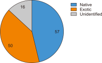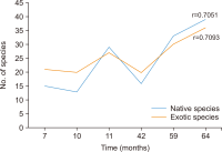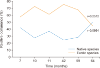 Primary succession on bare rocks is a challenge for invaders, including one of which was plants. The invasion of bare rock by exotic species raises the question of whether their presence hinders or facilitates succession. This study aimed to determine the role of exotic species in primary succession in six overburden (OB) coal mines using a chronosequence approach. Vegetation analysis was undertaken using line transects. Measurements were carried out on the absolute and relative coverage of each species. Native and exotic species were identified and grouped using information from local communities, identification books, and websites. The relationship between time and number of species, time, and relative dominance of exotic and native species was analyzed using Pearson’s correlation. Species number and dominance data were analyzed descriptively. The number of native species from the six OB heaps was higher (57) than that from exotic heaps (50). Neither the number of species nor the coverage showed a significant relationship with time. Exotic species predominated throughout the age of the embankment but tended to decrease over time. Temporary dominance by exotic species plays a role in assisting primary succession in the OB. This process might be prolonged without the temporary dominance of exotic species during early primary succession.