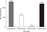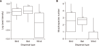 Seed dispersal supports community structure, maintains genetic connectivity across fragmented landscapes, and influences vegetation assemblages. In the Philippines, only two seed dispersal studies have compared different dispersal agents. We examined the seed dispersal patterns of water, wind, birds, and bats in the Caliraya Watershed, Philippines. We aimed to determine the floral species that were dispersed and how the forest characteristics influenced seed dispersal. By running seed rain traps and drift litter collection from March to June 2022, we analyzed 14,090 seeds in a privately owned study site within the watershed. Water did not exclusively disperse any species and acted as a secondary disperser. Seed density (seeds/trap) was significantly higher for bird-dispersed (n=166) and bat-dispersed (n=145) seeds than for wind-dispersed (n=79) seeds (One-way analysis of variance [ANOVA]: F2,87=16.21, P<0.0001). Species number (species/trap) was significantly higher for bird-dispersed (n=3.7) and bat-dispersed (n=3.9) seeds than for wind-dispersed (n=0.2) seeds (One-way ANOVA: F2,87=16.67, P<0.0001). Birds dispersed more species because they are more diverse and access a wider variety of fruits, unlike bats. Birds and bats target different fruits and provide separate seed dispersal services. Generalized linear model analyses revealed that the number and basal area of fleshy fruit trees most strongly influenced the bird seed dispersal patterns. Therefore, we recommend a three-way approach to restoration efforts in the Caliraya Watershed: (1) ensure the presence of fleshy fruit trees in restoration zones, (2) assist the establishment of mid-successional and wind-dispersed trees, and (3) intensify the conservation efforts for both flora and faunal diversity.