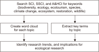 This study analyzed research trends in the field of ecological research. Data were collected based on a keyword search of the SCI, SSCI, and A&HCI databases from January 2002 to September 2022. The seven keywords, including biodiversity, ecology, ecotourism, species, climate change, ecosystem, restoration, wildlife, were recommended by ecological research experts. Word clouds were created for each of the searched keywords, and topic map analysis was performed. Topic map analysis using biodiversity, climate change, ecology, ecosystem, and restoration each generated 10 topics; topic maps analysis using the ecotourism keyword generated 5 topics; and topic map analysis using the wildlife keyword generated 4 topics. Each topic contained six keywords.