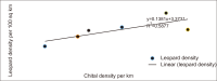 The leopard (Panthera pardus) is one of the most widespread felids worldwide. Despite their wide distribution, reliable data on leopard population densities are still inadequate for conservation and management strategies in different landscapes. In the present study, we estimated leopard density using camera traps in the Ranthambhore Tiger Reserve (RTR), Rajasthan, India, between December 2010 and February 2011, where leopards coexist alongside a high density of tigers (Panthera tigris), a larger predator (RTR). A sampling effort of 4,450 trap days was made from 178 camera trapping stations over 75 days, resulting in 46 suitable photo captures (25 right flanks and 21 left flanks). In total, 18 individuals (7 males, 8 females, and 3 unknown sexes) were identified using the right flanks, and the estimated leopard density was 8.8 (standard error=2.8) individuals/100 km2. Leopard density appeared to respond to small prey (<50 kg weight) richness. As this is the first systematic study to provide baseline information on leopard density in RTR, it could form a baseline for comparison in future investigations.
