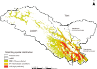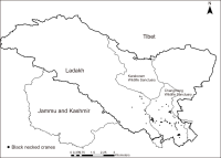 The Tibetan Plateau is home to the only alpine crane species, the black-necked crane (Grus nigricollis). Conservation efforts are severely hampered by a lack of knowledge on the spatial distribution and breeding habitats of this species. The ecological niche modeling framework used to predict the spatial distribution of this species, based on the maximum entropy and occurrence record data, allowed us to generate a species-specific spatial distribution map in Ladakh, Trans-Himalaya, India. The model was created by assimilating species occurrence data from 486 geographical sites with 24 topographic and bioclimatic variables. Fourteen variables helped forecast the distribution of black-necked cranes by 96.2%. The area under the curve score for the model training data was high (0.98), indicating the accuracy and predictive performance of the model. Of the total study area, the areas with high and moderate habitat suitability for black-necked cranes were anticipated to be 8,156 km2 and 6,759 km2, respectively. The area with high habitat suitability within the protected areas was 5,335 km2. The spatial distribution predicted using our model showed that the majority of speculated conservation areas bordered the existing protected areas of the Changthang Wildlife Sanctuary. Hence, we believe, that by increasing the current study area, we can account for these gaps in conservation areas, more effectively.