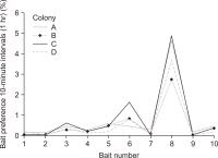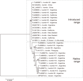 In this study, the distribution, bait preference, hosts, symbionts, habitat status, and cytochrome c oxidase subunit-I sequences of the ant Linepithema humile were analyzed. This species habitat comprised approximately 1.5 km along stone crevices, flower gardens, roadsides, and container yards in the vicinity of Busan station, Korea. Feeding activity of this species was confirmed in 9 species of 7 families of plants. Which was approximately 14% of total flora (63 species of 37 families) in the studied area. Particularly, it was observed that Dendranthema indicum and Camellia japonica were the most frequently visited. Further, we verified that they interacted with four species of aphids. We identified 22 species of ants (17 genera, 4 subfamilies) inhabiting the Busan station area, including L. humile, Tetramorium tsushimae, Nylanderia flavipes and the alien species Paratrechina longicornis. In areas where L. humile was the dominant species, the habitat of local native ants was reduced by approximately 30%. Bait preference was ranked in the following order: jelly, water with glucose (25%), and yogurt, with the highest preference for baits containing sugar and protein. The 630-bp cytochrome c oxidase subunit-I sequences of the local L. humile populations were 99% identical to those of L. humile in the National Center for Biotechnology Information database, and the Argentine ants that invaded Korea had a sequence identical to that of other invasive populations from China, Japan, and New Zealand. As L. humile rapidly increases due to domestic adaptation, continuous monitoring and control strategy for eradication are needed to protect domestic biodiversity.