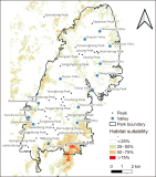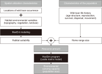 Understanding the carrying capacity of a habitat is crucial for effectively managing populations of wild boars (Sus scrofa), which are designated as harmful wild animal species in national parks. Carrying capacity refers to the maximum population size supported by a park's environmental conditions. This study aimed to estimate the appropriate wild boar population size by integrating population characteristics and habitat suitability for wild boars in the Bukhansan National Park using the HexSim program. Population characteristics included age, survival, reproduction, and movement. Habitat suitability, which reflects prospecting and resource acquisition, was determined using the Maximum Entropy model. This study found that the optimal population size for wild boar ranged from 217 to 254 individuals. The population size varied depending on the amount of resources available within the home range, indicating fewer individuals in a larger home range. The estimated wild boar population size was 217 individuals for the minimum amount of resources (50% minimum convex polygon [MCP] home range), 225 individuals for the average amount of resources (95% MCP home range), and 254 individuals for the maximum amount of resources (100% MCP home range). The results of one-way analysis of variance revealed a significant difference in wild boar population size based on the amount of resources within the home range. These findings provide a basis for the development and implementation of effective management strategies for wild boar populations.