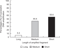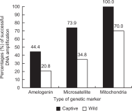 In this review, we compared the success rates of DNA amplification and introduced the efficient non-invasive sampling of fecal samples collected from captive and wild Korean long-tailed gorals (Naemorhedus caudatus) by referring to previous non-invasive studies, including three important references (Kim et al., 2008; Kim, 2021; Kim, 2022). A large difference in PCR success rates in the captive and wild populations was observed for mitochondrial (100 and 70.0%), sex-linked (44.4 and 20.8%), and microsatellite markers (73.9 and 34.8%, respectively). Out of the three types of genetic markers, the mitochondrial maker showed the highest success rate, followed by microsatellite and sex-linked markers. In addition, we estimated two factors that affected the PCR success, including the length of the amplified fragments (long, medium, and short) and the type of primer (universal and specific) in fecal samples from a captive population. The length of the PCR fragment was inversely proportional to the PCR success (5.3, 44.4, and 55.6% for long, medium, and short fragments, respectively), and the specific primer set (100%) was more efficient than the universal primer set (60.0%). This review is fundamental but would be greatly helpful for new non-invasive conservation genetic studies, particularly those that use fecal samples from captive and wild populations of rare endangered species. We recommend beginning conservation genetic experiments using mitochondrial markers and then nuclear markers, such as microsatellite and sex-linked markers, to save time, costs, and labor.