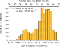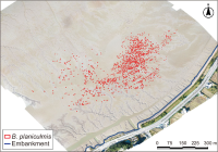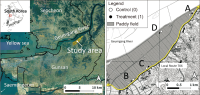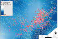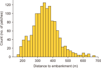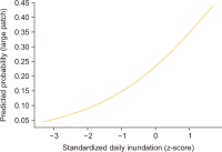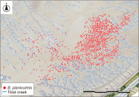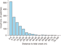 This study investigated the spatial distribution of the native halophyte Bolboschoenus planiculmis in the tidal wetlands of the Geum Estuary and analyzed its association with key hydrological factors. Based on drone imagery acquired in October 2024, a total of 1,344 patches were identified, covering a cumulative area of 13,754 m2. These patches were primarily concentrated at an average distance of 351 meters from the terrestrial embankment. While over 74% of patch centroids were located within 15 meters of tidal creeks, multivariate logistic regression analysis indicated that proximity to creeks did not have a statistically significant effect on patch size (P>0.05). In contrast, average daily inundation duration (15.2-18.9 hours/day, mean 17.6 hours) showed a significant positive correlation with the formation of larger patches (odds ratio=1.75, P<0.001), suggesting that inundation regime is a key driver of patch development. The findings highlight the species’ preference for mid-to lower-intertidal zones and underscore the importance of tidal and inundation management in formulating effective conservation and restoration strategies for halophytic plant habitats in estuarine ecosystems.